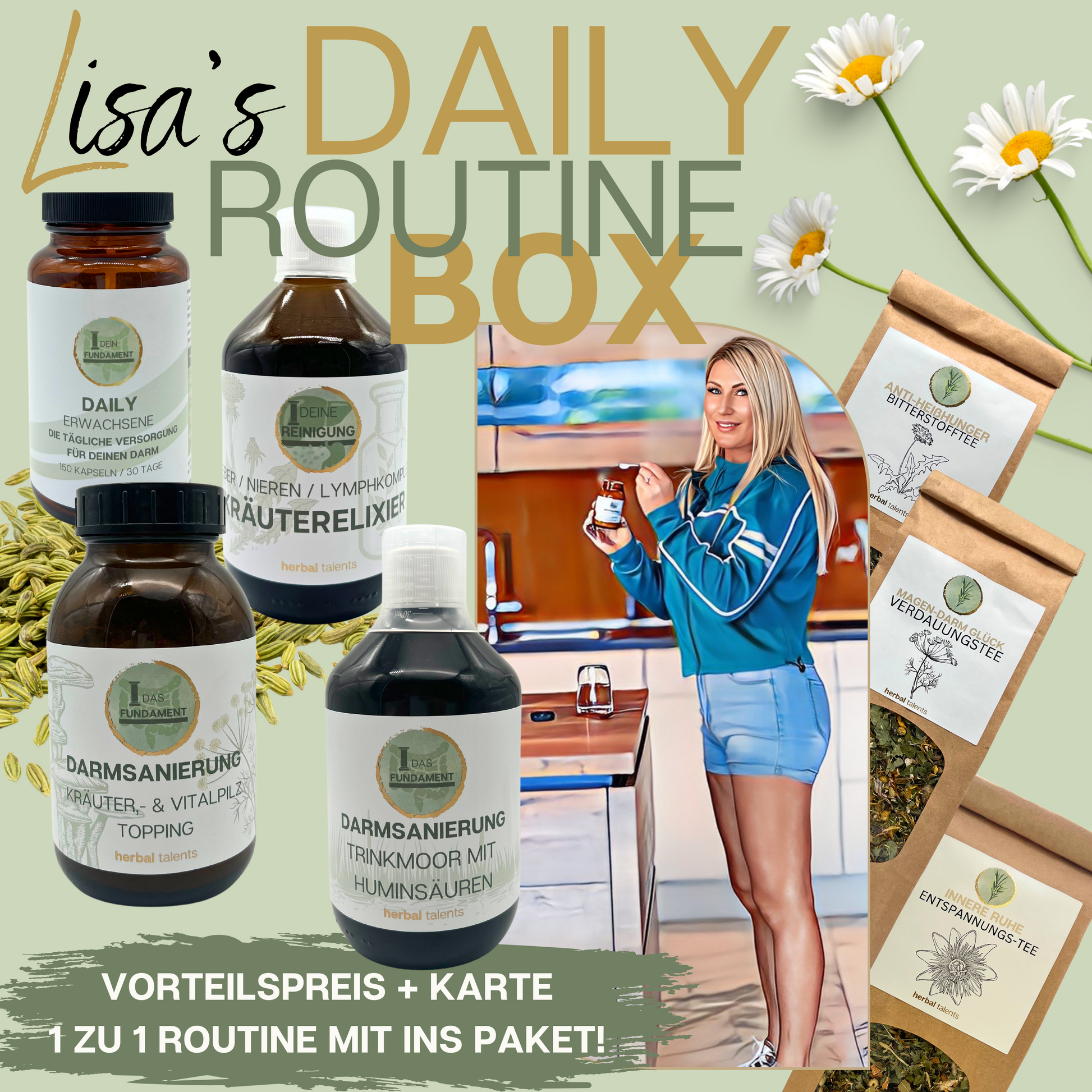 Diese Box enthält alle Produkte aus Lisas täglicher Healthy Routine. Alle Produkte in der Box erhaltet ihr exklusiv zu einem Vorteilspreis & obendrauf erhaltet ihr eine Karte mit der genauen täglichen Routine. Sie zielt darauf ab, täglich den Darm & Magen & die Entgiftungsorgane Leber, Nieren & Lymphsystem zu unterstützen & obendrauf eine ausreichende Flüssigkeitsroutine zu fördern.